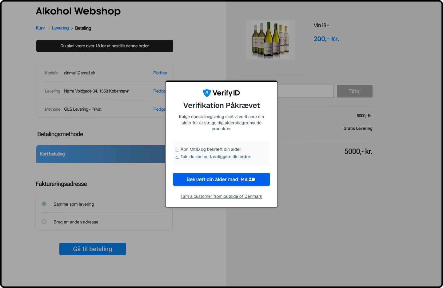 Aldersverifikation ved kassen sikrer, at kunderne opfylder de nødvendige alderskrav, inden betalingen kan gennemføres. Hvis en kunde er under 16 eller 18 år, afhængigt af produktet, vil ordren automatisk blive afvist.