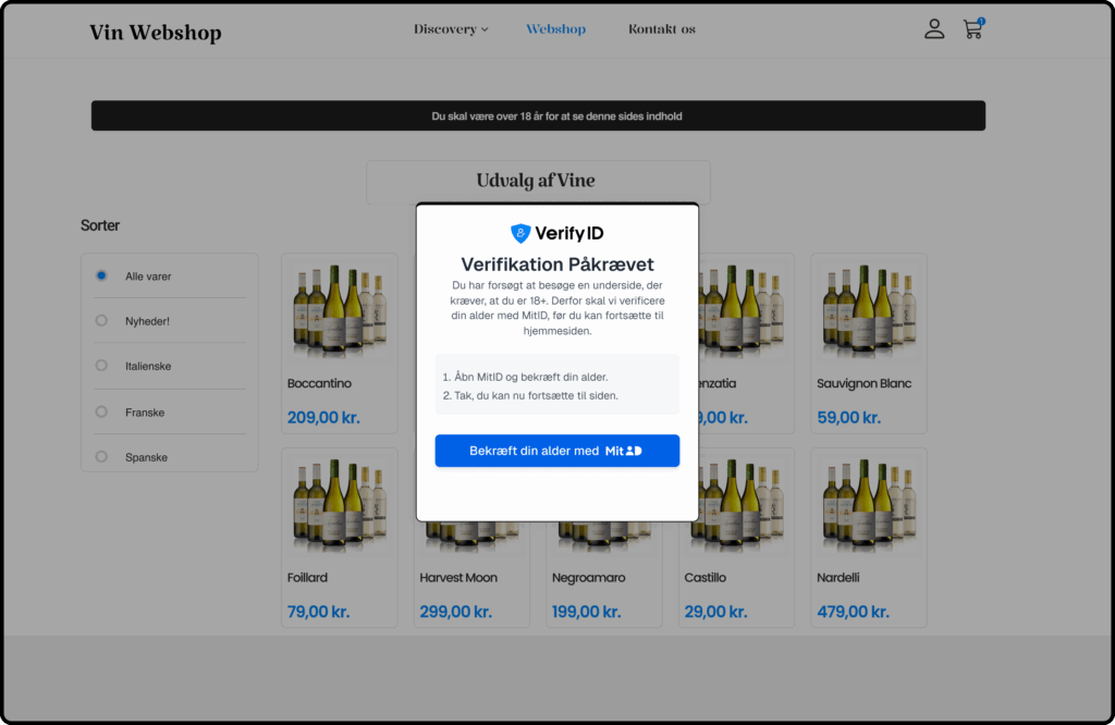 Aldersverifikation på undersider sikrer, at kun brugere, der opfylder alderskravene, kan få adgang til f.eks. /shop eller /alkohol. Resten af hjemmesiden forbliver frit tilgængelig, mens de aldersbegrænsede undersider forbliver lovlige og ansvarlige.